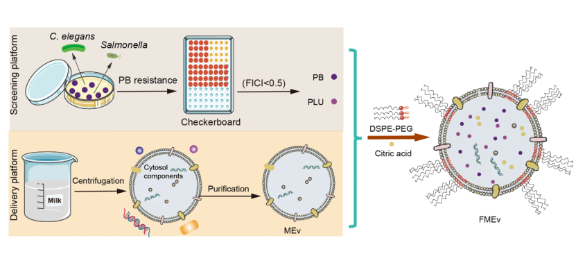 多重耐药菌感染的频发对抗菌药物研发提出了严峻挑战,迫切需要新策略以有效对抗耐药菌。本研究聚焦抗生素佐剂的筛选与机制研究,创新性地设计了递送体系,通过组合疗法和细胞间运输的协同作用,显著增强了抗菌治疗效果。建立了一种以体外诱导的多黏菌素高耐药菌株为模型的筛选平台,获得了能够显著增强多黏菌素疗效的plumbagin。将多黏菌素和plumbagin共同负载于功能化乳源囊泡中,通过破坏细菌膜结构、干扰能量代谢,展示强大的抗菌活性。此外,通过柠檬酸介导的紧密连接可逆性打开机制实现高效的细胞间运输,在小鼠感染模型中表现出优异的治疗效果。