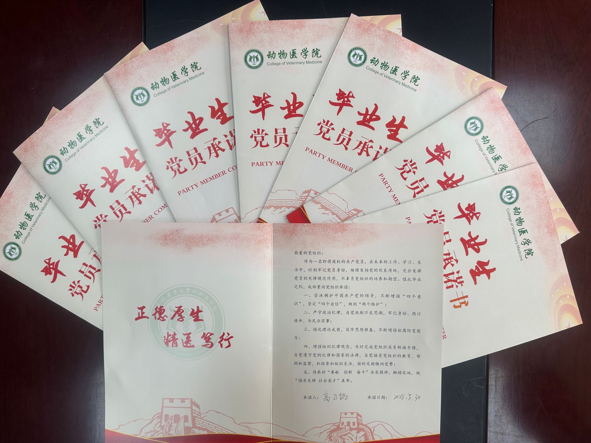 活动中,全体毕业生党员郑重签订了“承诺书”,承诺书内容涵盖了学习、工作、生活等多个方面,包括坚定理想信念、加强理论学习、遵守党纪国法、积极服务群众、勇于担当作为等。每一笔每一划都饱含着毕业生党员们的决心和承诺。党员们纷纷表示,这份承诺书不仅是一份责任,更是一份鞭策。基础兽医学方向高乙铭同学说:“签下承诺书,就意味着我们要对自己有更高的要求。在未来的工作中,我会以党员的标准严格要求自己,努力提升专业技能,为解决动物疾病问题贡献自己的智慧。”
