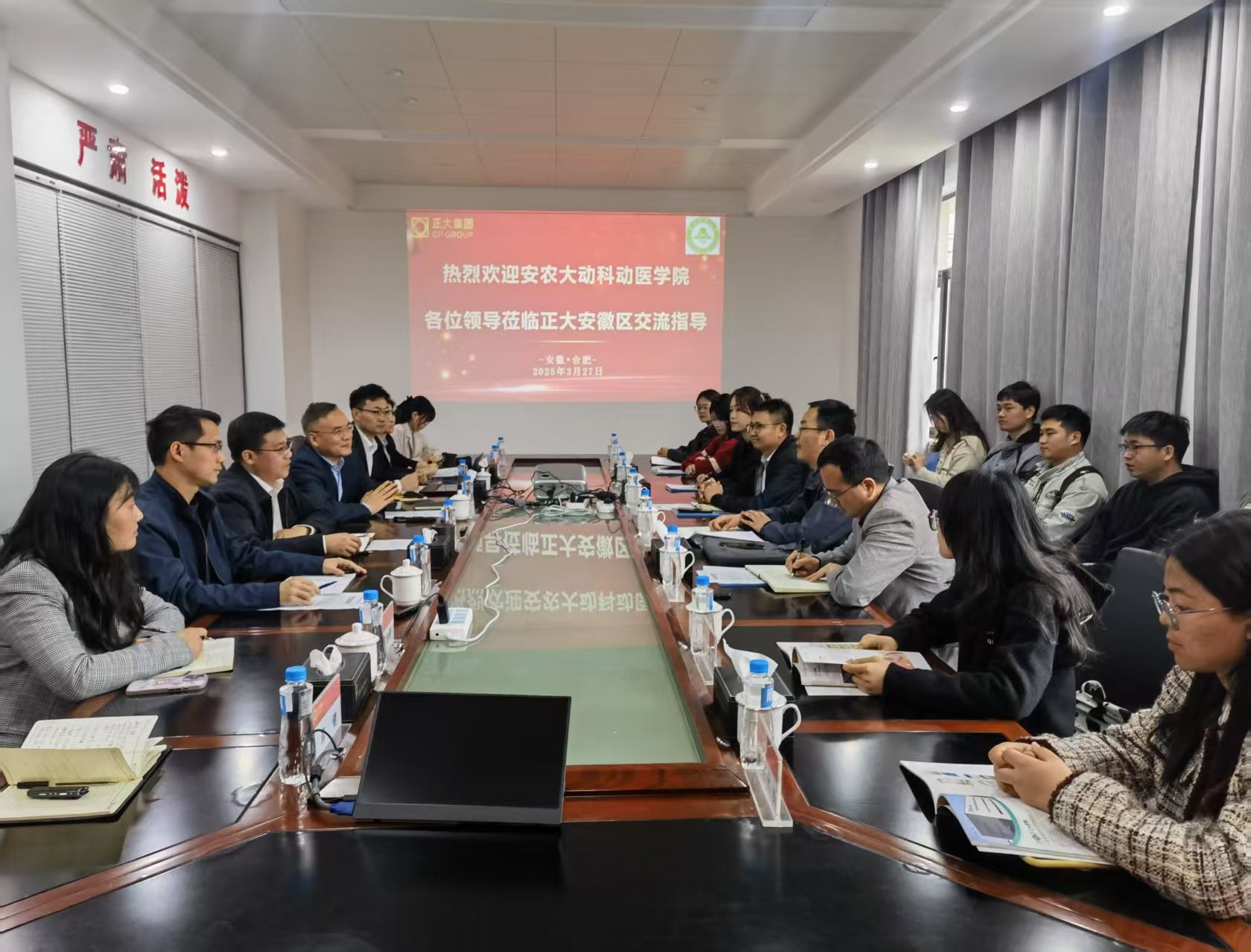 本网讯 3月27日下午,动物医公司党委书记吴永红、党委副书记张锐、动物科技公司党委副书记卢伟和10名毕业生代表赴合肥正大集团(安徽区)访企拓岗。正大集团安徽区饲料事业副总裁张俊波、人力资源总监林光阳、事业总经理2007级动物医学专业员工何志强等7名负责人参加活动。